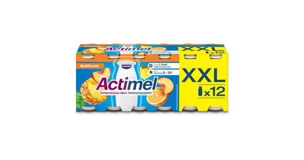 Milchmischerzeugnis mit Vitamin B6 und D. 1,5% Fett im Milchanteil Mhhh lecker – Multifrucht. Kennst du schon unsere aussergewöhnlich leckere Mischung aus tropischer Ananas, aromatischem Pfirsichund frischer Orange? Mit der exotischen Kombination bist du startklar für den Tag und durch die Vitamine B6 & D in unserem Actimel unterstützt du auch noch dein Immunsystem. Schütteln, Trinken, Startklar! – Zutaten: JOGHURT, entrahmte MILCH, Zucker, Fruchtsaft aus Fruchtsaftkonzentrat (1% Ananas, 0,6% Pfirsich, 0,3% Orange, 0,3% Erdbeere), Traubenzucker, MOLKENERZEUGNIS, modifizierte Stärke, Stabilisator Pektine, natürliches Aroma, Vitamin B6 und D, Kultur Lactobacillus casei. Zutaten: JOGHURT, entrahmte MILCH, Zucker, Fruchtsaft aus Fruchtsaftkonzentrat (1% Ananas, 0,6% Pfirsich, 0,3% Orange, 0,3% Erdbeere), Traubenzucker, MOLKENERZEUGNIS, modifizierte Stärke, Stabilisator Pektine, natürliches Aroma, Vitamin B6 und D, Kultur Lactobacillus casei.