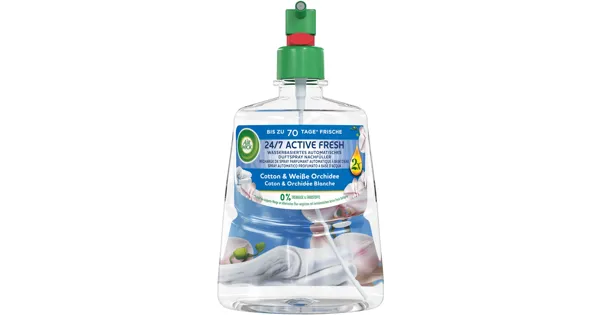 Verleihe deinem Zuhause jederzeit einen Hauch von Frische mit dem Airwick Active Fresh Nachfüller Cotton & Weisse Orchidee. Begeistere dich mit einem Duft, der Sanftheit und Eleganz vereint und für eine Wohlfühlatmosphäre sorgt. Mit einer Flasche erlebst du bis zu 70 Tage lang kontinuierliche Frische – perfekt für jeden Raum! Der wasserbasierte Duftspray-Nachfüller sorgt dafür, dass dein Umfeld frei von Treib- und Farbstoffen bleibt.