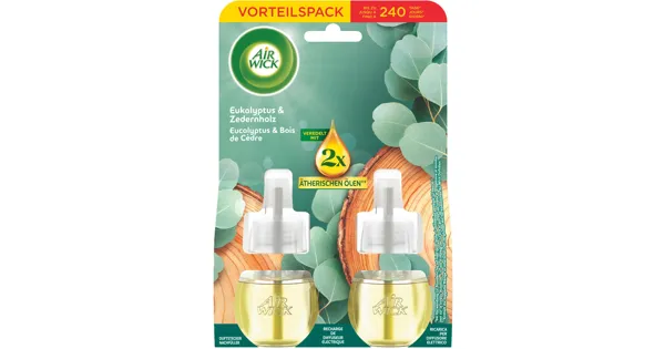 Tauche in eine erfrischende Welt mit dem Airwick Nachfüller für Duftstecker Eukalyptus & Zedernholz ein und verwandle dein Zuhause in eine Oase des Wohlgeruchs. Erlebe die belebende Frische von Eukalyptus kombiniert mit dem beruhigenden Duft von Zedernholz, angereichert mit hochwertigen ätherischen Ölen. Mit diesem Vorteilspack erhältst du zwei Nachfüller à 19 ml – perfekt für langanhaltende Frische bis zu 240 Tage.