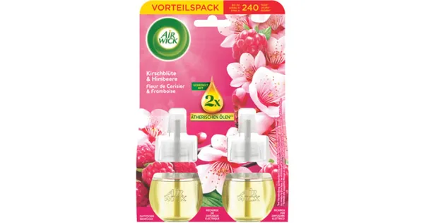 Erlebe mit dem Airwick Nachfüller für Duftstecker Kirschblüte & Himbeere eine Duftreise für deine Sinne. Jeder Nachfüller enthält 19 ml reinstes Dufterlebnis, das mit ätherischen Ölen veredelt wurde, um dein Zuhause bis zu 240 Tage in einen duftenden Rückzugsort zu verwandeln. Lass deinen Alltag hinter dir und geniesse die herrliche Kombination aus süssen Himbeeren und zarten Kirschblüten.