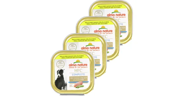 ALLEINFUTTERMITTEL FÜR HUNDE Die HFC Complete-Rezepturen für Hunde werden mit HFC-Zutaten zubereitet, das heisst mit Zutaten ursprünglich in Lebensmittelqualität, die wir nun für unsere Hundenahrung verwenden. Die Qualität, die du für dich selbst wählen würdest. Fleisch, Fisch und Gemüse, angereichert mit Mineralstoffen und Vitaminen für eine abwechslungsreiche Ernährung, mit der dein Hund alles bekommt, was er täglich braucht. Nassnahrung als Alleinfuttermittel, ideal für erwachsene Hunde, die nicht gerne Trockennahrung fressen (kleine Rassen, Hunde mit Zahnproblemen oder wählerische Hunde). Für eine abwechslungsreiche Ernährung empfiehlt Almo Nature, die verschiedenen Proteinquellen abwechselnd zu füttern. Die Aluminiumverpackung ist recycelbar und kann richtig entsorgt als Rohstoff für neue Verpackungen wiederverwendet werden. HFC Complete – getreidefreie Rezepturen mit besonders weicher Konsistenz – erhältlich in 85 g-Schalen. Almo Nature ist die engagierte Marke, die zu 100 % der Stiftung „Fondazione Capellino gehört.