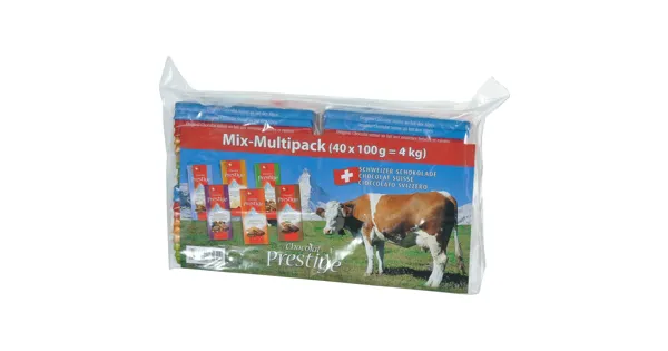 40 x zarte Alprose Prestige Schokolade assortiert: Prestige Milchschokolade, Prestige Milchschokolade mit 5% gehackten Haselnüssen, Prestige Milchschokolade mit 13% Rosinen und 5% gehackten Haselnüssen, Prestige Milchschokolade mit 5% Crisps, Prestige Zartbitterschokolade 50% und Prestige Weisse Schokolade.