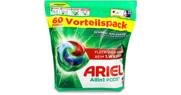 Entdecke Ariel, die Nr. 1 der meistempfohlenen Marken führender Waschmaschinen-Hersteller in Deutschland wie: Bauknecht, Siemens, Bosch und AEG, die die All-in-1 PODS-Waschkapseln als Waschmittel empfehlen Universal+. Sie haben eine zusätzliche, rote Kammer und bieten kraftvolle Fleckenentfernung schon ab dem ersten Waschgang. Sie wirken sogar gegen 7 Tage lang eingetrocknete Flecken. Zudem wurden sie für die Kaltwäsche entwickelt und lösen sich selbst in kaltem Wasser schnell auf. Wasche kälter mit den Ariel All-in-1 PODS Universal+ : Spare Energie bei jedem Waschgang und reduziere Deine CO₂-Emissionen. Die zu 100 % wasserlösliche Folie der PODS löst sich bei Kontakt mit dem Wasser vollständig auf und setzt die kraftvolle Formel zur Fleckenentfernung frei, die für Ariels gründlichste und stärkste Reinigung mit All-in-1 PODS Universal+ sorgt. Achtung: Darf nicht in die Hände von Kinderngelangen. Verursacht schwere Augenschäden. Verursacht Hautreizungen. Bewahre die Ariel All-in-1 PODS Waschkapseln stetsausser Reichweite von Kindern auf. Mehr unter keepcapsfromkids.eu. – Zutaten: >30% Anionische Tenside, 5-15% Nichtionische Tenside, <5% Phosphonate, Seife, Enzyme, Optische Aufheller, Duftstoffe, Alpha-Isomethyl Ionone, Citronellol, Citrus Aurantium Peel Oil, Coumarin, Eugenol, Limonene, Pogostemon Cablin Oil, Rose Ketones, Terpineol, Tetramethyl Acetyloctahydronaphthalenes Zutaten: >30% Anionische Tenside, 5-15% Nichtionische Tenside, <5% Phosphonate, Seife, Enzyme, Optische Aufheller, Duftstoffe, Alpha-Isomethyl Ionone, Citronellol, Citrus Aurantium Peel Oil, Coumarin, Eugenol, Limonene, Pogostemon Cablin Oil, Rose Ketones, Terpineol, Tetramethyl Acetyloctahydronaphthalenes