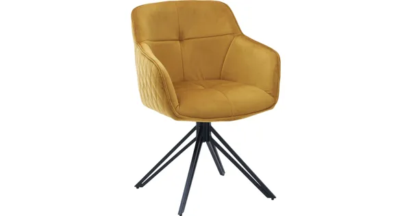 Der Armlehnstuhl Emma vereint Retro mit modernem, stilvollem Design. Der Bezug aus Samtvelours in trendigem Goldton lädt dazu ein, sich entspannt hinzusetzen und bereichert nicht nur dein Zuhause, sondern dient auch als echtes Highlight in jedem Raum. Dank der 180°-Drehfunktion kann man auch in engen Räumen mühelos Platz nehmen. Mit einer Sitzhöhe von 50 cm passt der Stuhl zu den gängigsten Esstischen, dient als wertvolle Ergänzung im Home-Office oder macht auch als Lesesessel in der Ecke eine gute Figur.