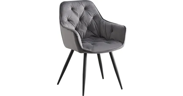 Unser Stuhl Romana setzt ein dekoratives Highlight im Esszimmer. Die schwarzen, pulverbeschichteten Metallbeine geben dem Stuhl Stabilität und einen modernen Stil. Die fest gepolsterte Sitzschale mit Armlehnen wird mit einer edlen Steppung in Szene gesetzt und bietet einen hohen Sitzkomfort.