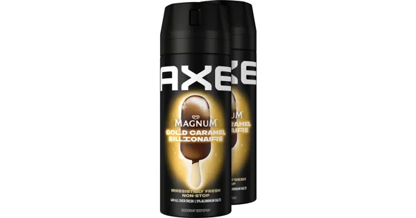 Das Deodorant Bodyspray Magnum Gold Caramel Billionaire von Axe entstand in Zusammenarbeit mit Magnum. Es duftet nach Caramel, Schokolade und süssem Chai Tee, das mit Noten von Sandelholz, Bergamotte und Zimt ergänzt wird. Der Körperspray verleiht dir einen verführerischen Duft, schützt vor Körpergeruch und sorgt für bis zu 48 Stunden anhaltende Frische.