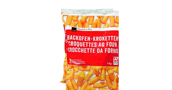 Backofen-Kroketten vorfrittiert – Zutaten: Kartoffelpüree aus Flocken 86% (Wasser, Kartoffeln, MILCHPROTEIN, MAGERMILCHPULVER, Kurkuma), Rapsöl, VOLLMILCHPULVER, MILCHPROTEIN, Kochsalz,...
