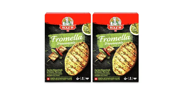 Schweizer Frischkäse, vollfett, aus pasteurisierter Milch, mariniert Schweizer Frischkäse, vollfett, aus pasteurisierter Milch, mariniert. Diese Packung enthält 2 Käse-Steaks, einzeln verpackt, an einer feinen Würz-Marinade. Steak de fromage provençale mit Kirschtomaten im Zucchini- oder Basilikum-Mantel. Die Käse-Steaks Fromella Provençale sind eine einzigartige Schweizer Spezialität aus Frischkäse mariniert mit einer köstlichen provenzalischen Marinade, die ideal für das Grillen ist. Nach einigen Minuten werden die Käse-Steaks aussen schön knusprig und innen zart schmelzend. Rezept: Die Kirschtomaten mit Zucchinistreifen oder Basilikumblättern umwickeln und mit Hilfe von Zahnstochern feststecken. Die Käse-Steaks für einige Minuten auf den Grill legen und zusammen mit den Tomatenspiessen servieren. Guten Appetit! – Zutaten: FRISCHKÄSE (90%), Marinade (Sonnenblumenöl, Kochsalz, Gewürze, Kräuter, Würze, Spinatpulver, Gewürzextrakt). Zutaten: FRISCHKÄSE (90%), Marinade (Sonnenblumenöl, Kochsalz, Gewürze, Kräuter, Würze, Spinatpulver, Gewürzextrakt).