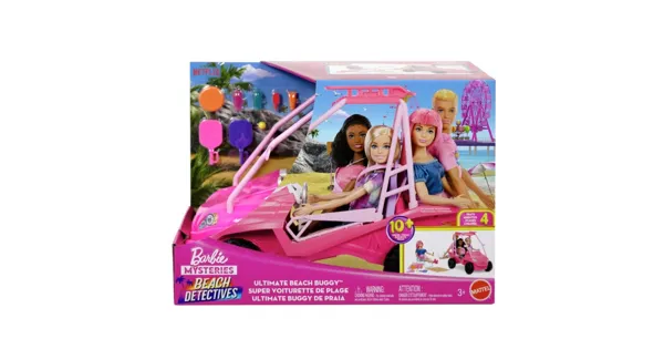 Mit dem „Barbie Mysteries: Beach Detectives“ Strand-Buggy-Spielset können sich Kinder alle möglichen Strandgeschichten ausdenken. Dieser von der Erfolgsserie inspirierte sportliche Strand-Buggy mit seiner pinkfarbenen Karosserie, Dachgepäckträger und Sitzen für bis zu vier Puppen (separat erhältlich) befördert Fans an die Küste. Kinder können ihre Puppen darin Platz nehmen lassen, ihre Ausrüstung auf dem Dach verstauen und ihn anschieben, um loszufahren und den idealen Platz im Sand zu finden. Mehr als 10 passende Zubehörteile regen zu kreativen Geschichten an – inklusive Strandstuhl, buntes Handtuch, Kühlbox, Snacks und mehr. Kinder und Fans ab 3 Jahren werden es lieben, Szenen nachzustellen oder sich Strandabenteuer auszudenken! Puppen nicht enthalten. Abweichungen in Farbe und Gestaltung vorbehalten.
