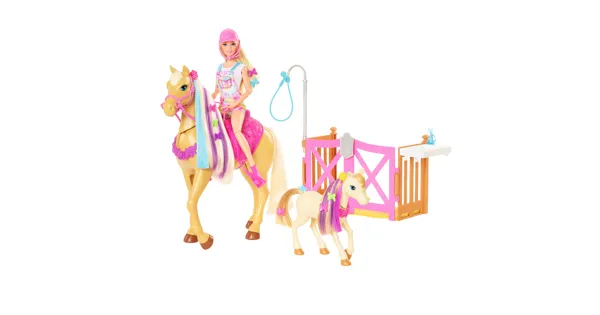 Sobald Zaun, Trog, Dusch- und Frisierstation aufgebaut sind, kann der Pflege- und Stylingspass beginnen! In Wasser getaucht erscheinen bunte Strähnen in den Mähnen der Pferde. Sobald Zaun, Trog, Dusch- und Frisierstation aufgebaut sind, kann der Pflege- und Stylingspass beginnen! In Wasser getaucht erscheinen bunte Strähnen in den Mähnen der Pferde.