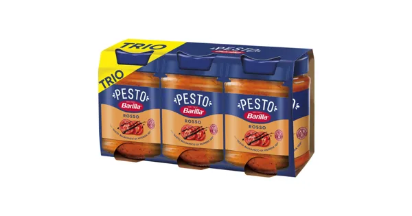 PESTO MIT TOMATEN, BASILIKUM UND “ACETO BALSAMICO DI MODENA g.g.A.” (BALSAMICO-ESSIG AUS MODENA) Barilla Pesto Rosso vereint aromatische Tomaten mit feinem italienischen Käse und hochwertigen Kräutern zu einer geschmackvollen Sauce. Ideal für Pasta oder als Dip, bringt dieses Pesto mediterranes Flair in Ihre Küche. Glutenfrei und vielseitig einsetzbar, überzeugt es durch besten Geschmack und Qualität. – Zutaten: Tomatenfruchtfleisch 34,9%, pflanzliche Öle (Olive, Sonnenblume), Tomatenmarkkonzentrat 15%, Glukosesirup, Grana Padano g.U. Käse (MILCH, Lysozym aus EI), CASHEWNÜSSE, Salz, Basilikum, Balsamico-Essig ‘Aceto balsamico di Modena’ g.g.A. 2% (Weinessig, gekochter Traubenmost), Molkepulver (MILCH), Pecorino Romano g.U. Schafkäse (SchafsMILCH), Zucker, Reisstärke, Knoblauch, Säureregulator: Milchsäure, natürliches Aroma (MILCH). KANN SPUREN VON ANDEREN SCHALENFRÜCHTEN ENTHALTEN. Zutaten: Tomatenfruchtfleisch 34,9%, pflanzliche Öle (Olive, Sonnenblume), Tomatenmarkkonzentrat 15%, Glukosesirup, Grana Padano g.U. Käse (MILCH, Lysozym aus EI), CASHEWNÜSSE, Salz, Basilikum, Balsamico-Essig ‘Aceto balsamico di Modena’ g.g.A. 2% (Weinessig, gekochter Traubenmost), Molkepulver (MILCH), Pecorino Romano g.U. Schafkäse (SchafsMILCH), Zucker, Reisstärke, Knoblauch, Säureregulator: Milchsäure, natürliches Aroma (MILCH). KANN SPUREN VON ANDEREN SCHALENFRÜCHTEN ENTHALTEN.