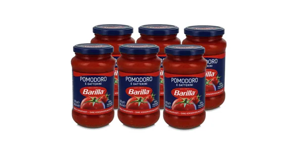 TOMATENSAUCE MIT TOMATEN UND DATTELTOMATEN Die Barilla Sauce Pomodoro bietet authentischen italienischen Geschmack und besteht aus sonnengereiften Tomaten. Perfekt für schnelle und einfache Mahlzeiten, passt diese vielseitige Sauce hervorragend zu Pasta und verleiht Ihren Gerichten eine mediterrane Note. Ohne gluten- oder laktosehaltige Zutaten zubereitet, ist sie ideal für eine bewusste Ernährung. – Zutaten: Tomatenfruchtfleisch 74%, Tomatenmarkkonzentrat 12%, passierte Datteltomaten 4%, pflanzliche Öle (Olive, Sonnenblume), Zwiebeln 2,8%, Zucker, Salz, natürliche Aromen, Knoblauch, schwarzer Pfeffer. Zutaten: Tomatenfruchtfleisch 74%, Tomatenmarkkonzentrat 12%, passierte Datteltomaten 4%, pflanzliche Öle (Olive, Sonnenblume), Zwiebeln 2,8%, Zucker, Salz, natürliche Aromen, Knoblauch, schwarzer Pfeffer.