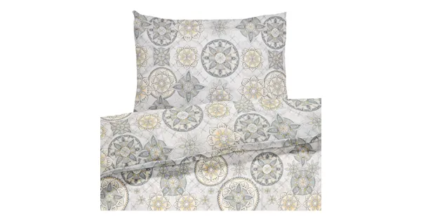 Diese stilvolle Bettwäsche mit einem Alloverprint aus kunstvollen Mandalas ist eine hübsche Aufwertung für dein Schlafzimmer. Die dezenten Farben sorgen für Ruhe und Geborgenheit. Sie ist perfekt für alle, die eine helle, freundliche Einrichtung mit schlichten Farben bevorzugen.