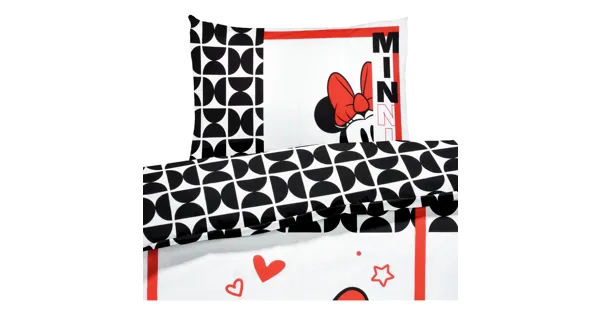 Die Kult-Maus hält Einzug ins Schlafzimmer! Auf der Vorderseite der Bettwäsche macht sich Minnie hübsch für Mickey und auf dem Kopfkissen liebäugelt sie um die Ecke. Die Rückseite der Wende-Bettwäsche ist mit einem schwarz weissen Alloverprint bedruckt. Mit ihrem trendigen Design lässt die Bettwäsche die Herzen grosser und kleiner Minnie Maus Fans höher schlagen!