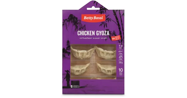 Teigtaschen mit Pouletfleischzubereitung – Zutaten: Teig (WEIZENMEHL, Wasser, WEIZENGLUTEN, Kochsalz jodiert), Poulet 25% (Schweiz), Chinakohl, Karotten, Sojasauce (Wasser, SOJABOHNEN, WEIZEN, Kochsalz, Speiseessig, Zucker), Schnittlauch, SESAMÖL, Kochsalz jodiert, Knoblauchpulver, Ingwerpulver. Zutaten: Teig (WEIZENMEHL, Wasser, WEIZENGLUTEN, Kochsalz jodiert), Poulet 25% (Schweiz), Chinakohl, Karotten, Sojasauce (Wasser, SOJABOHNEN, WEIZEN, Kochsalz, Speiseessig, Zucker), Schnittlauch, SESAMÖL, Kochsalz jodiert, Knoblauchpulver, Ingwerpulver.
