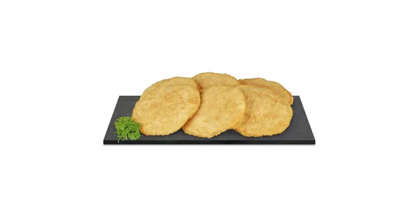 Pouletfleischerzeugnis aus Fleischstücken zusammengefügt mit Schmelzkäsezubereitung und Pouletfleischerzeugnis gepökelt gefüllt, paniert, frittiert, aufgetaut – Zutaten: Pouletfleisch 53%...