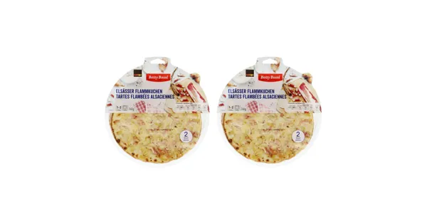 Teigboden belegt mit Zwiebeln, Quark, Schweinefleischerzeugnis, Käse und Crème fraîche Der Betty Bossi Elsässer Flammkuchen bietet eine köstliche Kombination aus knusprigem Boden und einer...