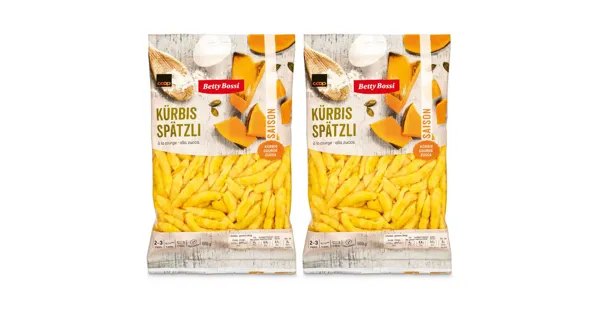 Spätzli mit Kürbis Idee Betty Bossi – Zutaten: Wasser, WEIZENMEHL 27%, Kürbis 18%, EIER* 8%, HARTWEIZENGRIESS, Kochsalz jodiert, Rapsöl, Kochsalz, Gewürze. * aus Freilandhaltung. Zutaten: Wasser, WEIZENMEHL 27%, Kürbis 18%, EIER* 8%, HARTWEIZENGRIESS, Kochsalz jodiert, Rapsöl, Kochsalz, Gewürze. * aus Freilandhaltung.