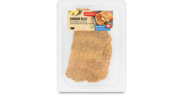 Schweinefleischzubereitung aufgetaut, mit Käse und Schweinefleischerzeugnis gepökelt, paniert – Zutaten: Schweinefleisch 58% (Schweiz), Paniermehl 12% (WEIZENMEHL, Kochsalz, Hefe, Paprika), KÄSE 11% (Le Gruyère AOP [Schweiz]), Panade 10% (EIER, Reisstärke, Kochsalz jodiert, Gewürze, Reismehl), Schweinefleischerzeugnis gepökelt 9% (Schweinefleisch [Schweiz], Wasser, Nitritpökelsalz [Kochsalz, Konservierungsstoff [E 250]], Maltodextrin, Stabilisatoren [E 450, E 451], Antioxidationsmittel [E 301], Liebstöckelextrakt). Zutaten: Schweinefleisch 58% (Schweiz), Paniermehl 12% (WEIZENMEHL, Kochsalz, Hefe, Paprika), KÄSE 11% (Le Gruyère AOP [Schweiz]), Panade 10% (EIER, Reisstärke, Kochsalz jodiert, Gewürze, Reismehl), Schweinefleischerzeugnis gepökelt 9% (Schweinefleisch [Schweiz], Wasser, Nitritpökelsalz [Kochsalz, Konservierungsstoff [E 250]], Maltodextrin, Stabilisatoren [E 450, E 451], Antioxidationsmittel [E 301], Liebstöckelextrakt).