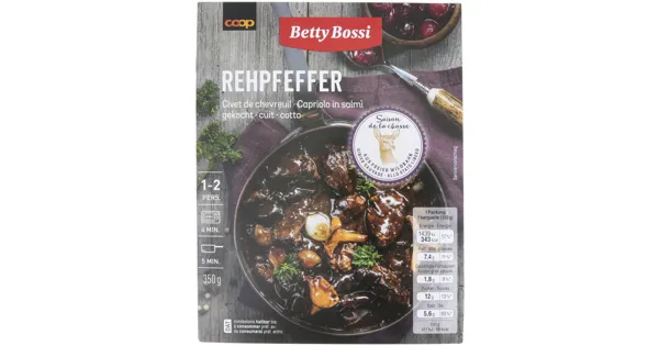 Rehfleischerzeugnis an Sauce – Zutaten: Rehfleischerzeugnis (Rehfleisch 43% [Herkunft siehe Datierungsfeld], Wasser, Rotwein [enthält Antioxidationsmittel [E 220 [SULFIT]]], Rotweinessig, Kochsalz, modifizierte Stärke, Glucosesirup getrocknet, Säureregulator [E 500], Gewürze, Rapsöl), Wasser, Rotwein (enthält Antioxidationsmittel [E 220 [SULFIT]]), Pilze (Champignons, Eierschwämme), Silberzwiebeln, Rindfleischextrakt, Aceto Balsamico di Modena IGP (Weinessig, Traubenmostkonzentrat), Zucker, modifizierte Stärke, Rapsöl, Preiselbeerkonfitüre 1%(Preiselbeeren, Zucker, Glucosesirup), Farbstoff (E 150d), Gewürzextrakte, Rotweinessig, Kochsalz jodiert, Orangensaftkonzentrat, Kochsalz, Säuerungsmittel (E 330), Glucosesirup getrocknet, Verdickungsmittel (E 415), Gewürze. Zutaten: Rehfleischerzeugnis (Rehfleisch 43% [Herkunft siehe Datierungsfeld], Wasser, Rotwein [enthält Antioxidationsmittel [E 220 [SULFIT]]], Rotweinessig, Kochsalz, modifizierte Stärke, Glucosesirup getrocknet, Säureregulator [E 500], Gewürze, Rapsöl), Wasser, Rotwein (enthält Antioxidationsmittel [E 220 [SULFIT]]), Pilze (Champignons, Eierschwämme), Silberzwiebeln, Rindfleischextrakt, Aceto Balsamico di Modena IGP (Weinessig, Traubenmostkonzentrat), Zucker, modifizierte Stärke, Rapsöl, Preiselbeerkonfitüre 1%(Preiselbeeren, Zucker, Glucosesirup), Farbstoff (E 150d), Gewürzextrakte, Rotweinessig, Kochsalz jodiert, Orangensaftkonzentrat, Kochsalz, Säuerungsmittel (E 330), Glucosesirup getrocknet, Verdickungsmittel (E 415), Gewürze.