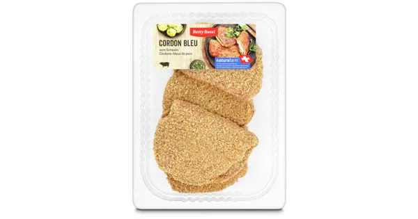 Schweinefleischzubereitung aufgetaut, mit Schmelzkäsezubereitung und Schweinefleischerzeugnis gepökelt, paniert – Zutaten: Schweinefleisch 57% (Schweiz), Paniermehl 13% (WEIZENMEHL, Kochsalz, Hefe, Paprika), Panade 11% (EIER, Reisstärke, Kochsalz jodiert, Gewürze, Reismehl), Schmelzkäsezubereitung 10% (KÄSE [Schweiz], Wasser, Kartoffelstärke, BUTTER, Kochsalz, Säuerungsmittel [E 331], Verdickungsmittel [E 410]), Schweinefleischerzeugnis gepökelt 9% (Schweinefleisch [Schweiz], Wasser, Nitritpökelsalz (Kochsalz, Konservierungsstoff [E 250]], Maltodextrin, Stabilisatoren [E 450, E 451], Antioxidationsmittel [E 301], Liebstöckelextrakt). Zutaten: Schweinefleisch 57% (Schweiz), Paniermehl 13% (WEIZENMEHL, Kochsalz, Hefe, Paprika), Panade 11% (EIER, Reisstärke, Kochsalz jodiert, Gewürze, Reismehl), Schmelzkäsezubereitung 10% (KÄSE [Schweiz], Wasser, Kartoffelstärke, BUTTER, Kochsalz, Säuerungsmittel [E 331], Verdickungsmittel [E 410]), Schweinefleischerzeugnis gepökelt 9% (Schweinefleisch [Schweiz], Wasser, Nitritpökelsalz (Kochsalz, Konservierungsstoff [E 250]], Maltodextrin, Stabilisatoren [E 450, E 451], Antioxidationsmittel [E 301], Liebstöckelextrakt).