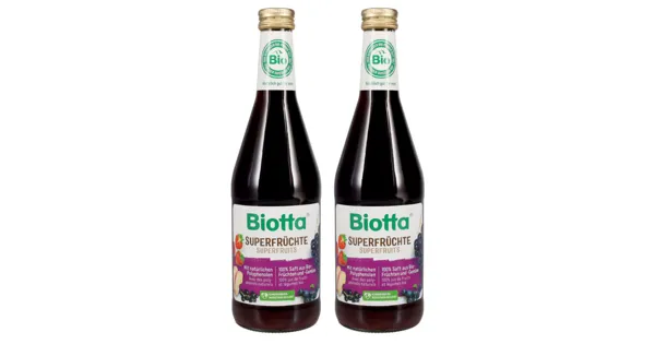 Bio Fruchtsaftcocktail mit Fruchtpüree und Schwarzkarottensaft Der Schweizer Bio-Pionier. Biotta gibt Ihnen mit jedem Schluck ein Stück Natur, das gesund ist und hervorragend schmeckt. Der Cocktail der Superfrüchte. Sorgfältig ausgewählte Beeren und Schweizer Äpfel stecken im Biotta Superfrüchte Saft. Seinen besonderen Geschmack erhält er durch die schwarze Ur-Karotte, die der Komposition ihr besonderes Aroma verleiht. – Zutaten: Traubensaft rot (Italien), Aroniasaft, Erdbeerpüree (15%), Apfelsaft, Schwarzkarottensaft (5%), Heidelbeersaft, Schwarzer Johannisbeersaft, Zitronensaft. Zutaten: Traubensaft rot (Italien), Aroniasaft, Erdbeerpüree (15%), Apfelsaft, Schwarzkarottensaft (5%), Heidelbeersaft, Schwarzer Johannisbeersaft, Zitronensaft.