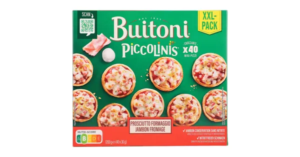 Mini Pizza mit Schinken geräuchert und Rohschinken geräuchert, tiefgekühlt – Zutaten: WEIZENMEHL, gehackte Tomaten 19%, KÄSE 16% (EDAMER), Wasser, Hinterschinken gekocht 8% (Schweinefleisch, Salz, Konservierungsstoff:Natriumnitrit, Dextrose, Stabilisator: Zitronensäure, Gewürzextrakte, Antioxidationsmittel: Ascorbinsäure, Rauch), Rapsöl, Rohschinken geräuchert 1.7% (Schweinefleisch, Salz, Gewürze, Zucker, Konservierungsmitteln: Natriumnitrit und Kaliumnitrat, Rauch), VOLLMILCHPULVER, Hefe, Salz, Zucker, Gewürze und Kräuter, Emulgator (SOJALECITHINE), Dextrose. Kann SELLERIE, KRUSTENTIERE, FISCH, SENF und NÜSSE enthalten. Zutaten: WEIZENMEHL, gehackte Tomaten 19%, KÄSE 16% (EDAMER), Wasser, Hinterschinken gekocht 8% (Schweinefleisch, Salz, Konservierungsstoff:Natriumnitrit, Dextrose, Stabilisator: Zitronensäure, Gewürzextrakte, Antioxidationsmittel: Ascorbinsäure, Rauch), Rapsöl, Rohschinken geräuchert 1.7% (Schweinefleisch, Salz, Gewürze, Zucker, Konservierungsmitteln: Natriumnitrit und Kaliumnitrat, Rauch), VOLLMILCHPULVER, Hefe, Salz, Zucker, Gewürze und Kräuter, Emulgator (SOJALECITHINE), Dextrose. Kann SELLERIE, KRUSTENTIERE, FISCH, SENF und NÜSSE enthalten.