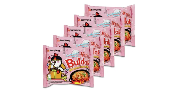Ramen-Nudeln mit scharfem Hühnergeschmack, Carbonara-Aroma, Zucker und Süssstoff – Zutaten: Nudeln (77.4%): WEIZENmehl (GLUTEN), Palmöl, Modifizierte Stärke (Kartoffel, Tapioka), Salz, Emulgatoren...