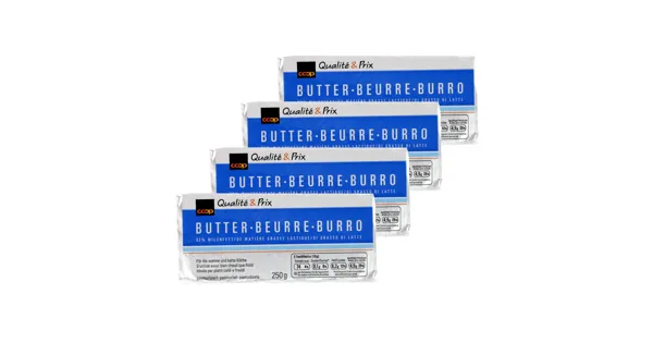 Aktion Butter, 82% Milchfett Coop Butter pasteurisiert. 250g. – Zutaten: Butter (aus pasteurisiertem RAHM). Zutaten: Butter (aus pasteurisiertem RAHM).