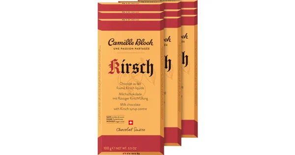 Camille Bloch Kirsch im Dreierpack für zwischendurch ist eine mit Kirschfüllung und feiner Zucker-Schutzhülle alkoholhaltige Tafelschokolade.