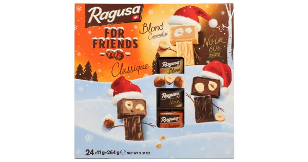 Pralinen Sortiment aus Schokolade mit Praliné-Füllung und ganzen Haselnüssen – Zutaten: Zucker, HASELNÜSSE (davon 9% ganze), Kakaomasse, Kakaobutter, karamellisiertes MILCHPULVER 6.7% (VOLLMILCHPULVER, karamellisierter Zucker 3%), Kokosfett, SOJAMEHL, VOLLMILCHPULVER, BUTTERREINFETT, Kakaopulver, Emulgator: Rapslecithin, MAGERMILCHPULVER, Vanilleextrakt. Kann Spuren von MANDELN enthalten. Classique: Schokolade 27%, Pralinen-Füllung 64%. Schokolade: mindestens 47% Kakao. Blond: weisse Schokolade 27%, Pralinen-Füllung 64%. Weisse Schokolade: mindestens 23% Kakao. Noir: Schokolade 27%, Pralinen-Füllung 64%. Schokolade: mindestens 60% Kakao. Zutaten: Zucker, HASELNÜSSE (davon 9% ganze), Kakaomasse, Kakaobutter, karamellisiertes MILCHPULVER 6.7% (VOLLMILCHPULVER, karamellisierter Zucker 3%), Kokosfett, SOJAMEHL, VOLLMILCHPULVER, BUTTERREINFETT, Kakaopulver, Emulgator: Rapslecithin, MAGERMILCHPULVER, Vanilleextrakt. Kann Spuren von MANDELN enthalten. Classique: Schokolade 27%, Pralinen-Füllung 64%. Schokolade: mindestens 47% Kakao. Blond: weisse Schokolade 27%, Pralinen-Füllung 64%. Weisse Schokolade: mindestens 23% Kakao. Noir: Schokolade 27%, Pralinen-Füllung 64%. Schokolade: mindestens 60% Kakao.