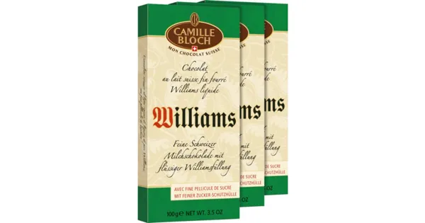 Camille Bloch Williams im Dreierpack für zwischendurch ist eine mit flüssiger Williamsfüllung und feiner Zucker-Schutzhülle alkoholhaltige Schweizer Milchschokolade.
