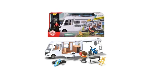 Freilauf Hymer Camping Van, Interieur, Dach + Türen z. Öffnen, Gummireifen, Figur, BBQ m.Licht, Jetbag, Fahrrad, Zubehör, 30 cm, mehrfarbig