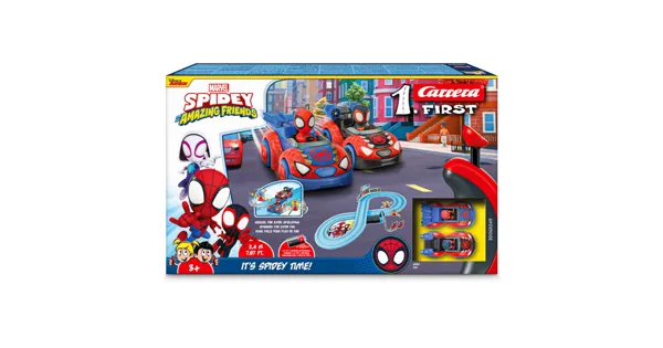 Rennspass mit Spidey und seinen Freunden.Der junge Peter Parker (kurz: Spidey) ist bereits ein beliebter Superheld, doch in der Kinderserie „Spidey und seine Superfreunde merkt er schnell, dass es noch einfacher ist, Menschen zu helfen, wenn man Freunde an seiner Seite hat. Im Carrera FIRST-Set „It's Spidey Time rast er zusammen mit seinem Kumpel Miles Morales alias Spin um die 2,4 Meter lange Bahn. Kinder ab 3 Jahren rasen auf einer batteriebetriebenen Bahn, die mit einem Kreisel ausgestattet ist - für noch mehr Spass. Zahlreiche Deko-Elemente mit Motiven aus der Serie schmücken die Bahn und sorgen für echte Spidey-Atmosphäre im Kinderzimmer-Motordrom.