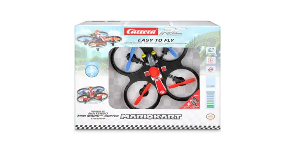 Hoch hinaus „It's-a-me - Mario! Als neues Mitglied der Carrera RC Nintendo Mario Kart™-Helden-Familie saust der Mini-Mario-Copter durch die Lüfte. Der nur 16,5 x 16,5 cm/6,5 x 6,5 cm grosse Quadrocopter mit einem Rotordurchmesser von 5,5 cm/2,2 cm ist „ready to fly und mit 2,4 GHz Digital Proportional Technologie ausgestattet. Dank spezieller Funktionen wie dem Einsteiger-/Fortgeschrittenen-Modus, der automatischen Start- und Landefunktion sowie der automatischen Höhenregelung gelingt auch jungen Piloten das Abheben mit diesem kleinen Überflieger problemlos. Dank des extra stabilen Rotorschutzkäfigs ist der Mini-Mario-Copter bei seinen bis zu 7 Minuten dauernden Flügen optimal geschützt. „Mamma mia! Hier ist Flugspass garantiert!