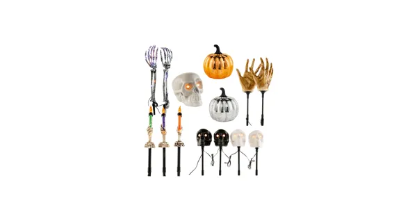 2x Skelett-Arme, 2 Stück 2x Zombie-Hände, 2 Stück 1x Kürbis, grau 19cm Durchmesser 1x Kürbis, orange 19cm Durchmesser 1x Halloween-Kerzen mit Totenkopf, 3 Stück 1x Schädel Kopf, 4 Stück 2x...