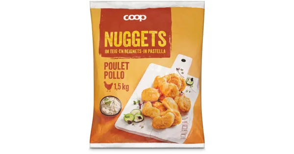 Pouletfleischerzeugnis aus Fleischstücken zusammengefügt, paniert, vorfrittiert, durchgegart – Zutaten: Pouletfleisch 55% (Brasilien), Wasser, Panade (Getreidemehle , WEIZENGLUTEN, Kochsalz,...