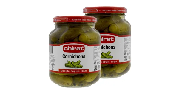 Essiggemüse – Zutaten: Cornichons, Branntweinessig, Zucker, Gewürze (SENFSAMEN, schwarzer Pfeffer), Meersalz, Geschmacksverstärker (Mononatriumglutamat), Zwiebeln, Estragon, Curcumaextrakt,...