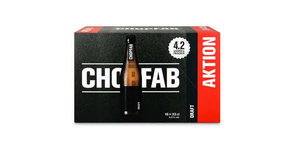 Bier Das Chopfab Draft ist ein leichtes und besonders frisches Lagerbier, gebraut mit den besten Zutaten. Die perfekte Erfrischung. – Zutaten: Wasser, GERSTENMALZ, Hopfen. Zutaten: Wasser, GERSTENMALZ, Hopfen.