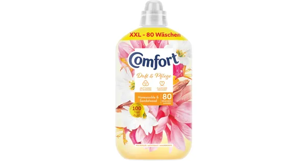 Mit dem flüssigen Weichspülkonzentrat Comfort Honeysuckle & Sandalwood werden deine Kleider flauschig weich und erhalten einen Duft nach Geissblatt und Sandelholz. Der Weichspüler mit Farb- und Faserschutz sorgt ausserdem dafür, dass deine Textilien länger wie neu aussehen.