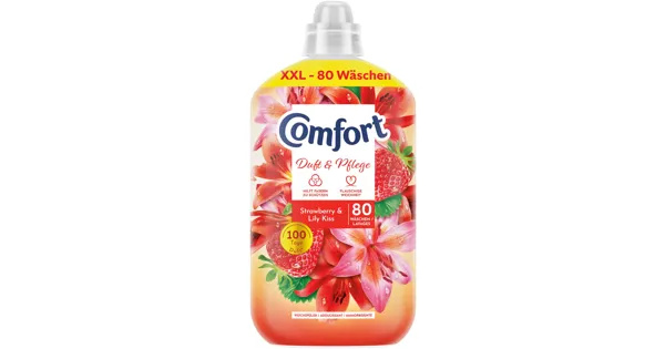 Mit dem flüssigen Weichspülkonzentrat Comfort Strawberry & Lily Kiss werden deine Kleider flauschig weich und erhalten einen blumig-fruchtigen Duft nach Erdbeere und Lilie. Der Weichspüler mit...