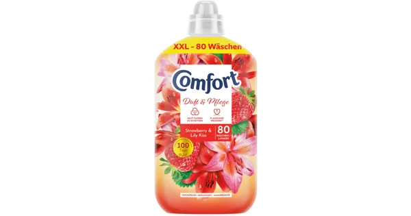 Mit dem flüssigen Weichspülkonzentrat Comfort Strawberry & Lily Kiss werden deine Kleider flauschig weich und erhalten einen blumig-fruchtigen Duft nach Erdbeere und Lilie. Der Weichspüler mit...