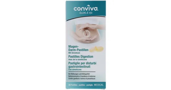 Medizinprodukt - Magen-Darm-Pastillen mit Simeticon conviva Magen-Darm-Pastillen sind ein Medizinprodukt, welches eine physikalische Wirkung hat. Simeticon wird unverändert wieder aus dem Darm...