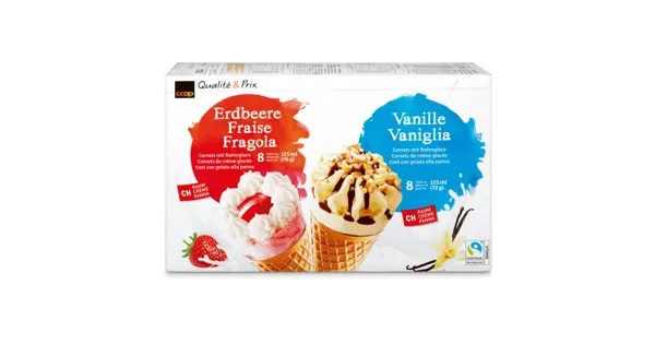 Cornet Erdbeere: Cornet mit Rahmglace Erdbeere und Nature mit 8% kakaohaltiger Fettglasur Cornet Vanille: Cornet mit Rahmglace Vanille, 12% kakaohaltiger Fettglasur und Haselnusssplittern –...