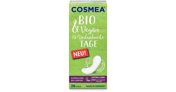 Slipeinlagen, Extra Lang, Bio COSMEA® Bio-Slipeinlagen Extra Lang sind weich, sicher und bieten optimalen Halt. Dank des leistungsstarken Saugkerns und der besonders dünnen Wäscheschutzfolie bietet sie auch unter Druck Sicherheit ohne Kompromisse. Anzahl: 26 StückAbmessungen: 83 x 206 mm, Dicke 2 mm
