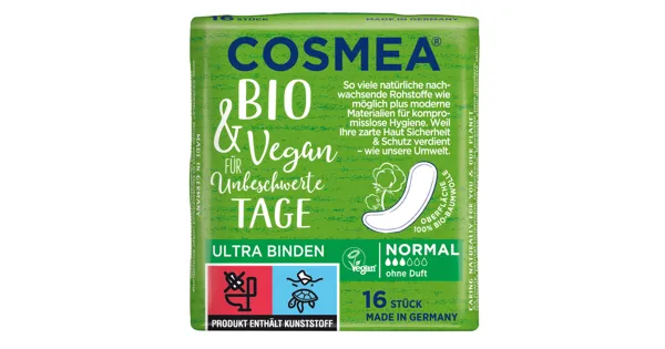 Damenbinde Ultra, Normal, Bio COSMEA® Bio-Ultra-Binden Normal werden mit einer Oberfläche aus 100% Bio-Baumwolle hergestellt. Sie sind so dünn, dass Sie kaum zu spüren sind – und zugleich super...