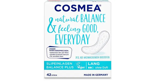 Slipeinlagen Balance, Lang COSMEA® Balance-Slipeinlagen Lang besitzen einen Saugkern aus einer neu entwickelten Zellulose, die Geruchsmoleküle effektiv bindet und nicht nur maskiert. Durch die Unterstützung des natürlichen pH-Wertes im Intimbereich wird zusätzlich die Neubildung von Gerüchen gehemmt – für ein frisches Gefühl den ganzen Tag. Anzahl: 42 StückAbmessungen: 70 x 185 mm, Dicke 2 mm
