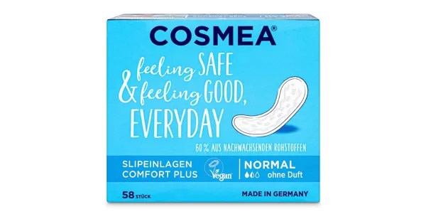 Slipeinlagen, Normal COSMEA® Slipeinlagen Normal besitzen einen Saugkern aus mikrofeinen Naturfasern und sind mit einer körperbetonten Passform ausgestattet. Sie sind besonders hautfreundlich, besitzen eine seidenweiche Oberfläche und sind besonders luftdurchlässig – einfach unspürbar. Anzahl: 58 StückAbmessungen: 67 x 155 mm, Dicke 2 mm