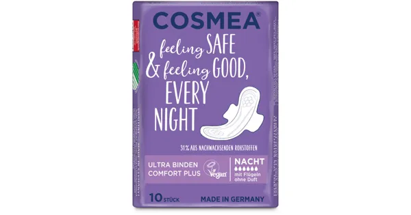 Damenbinde Ultra, Nacht mit Flügeln COSMEA® Ultra-Binden Nacht mit Flügeln sind extra lang und besonders für die Nacht geeignet. So dünn, dass sie kaum zu spüren sind – und zugleich super sicher....