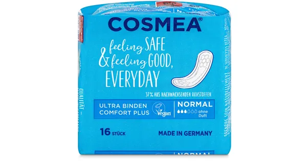 Damenbinde Ultra, Normal COSMEA® Ultra-Binden Normal sind ideal geeignet für leichte und mittlere Tage. So dünn, dass sie kaum zu spüren sind – und zugleich super sicher. Dank ihrer körpergerechten...